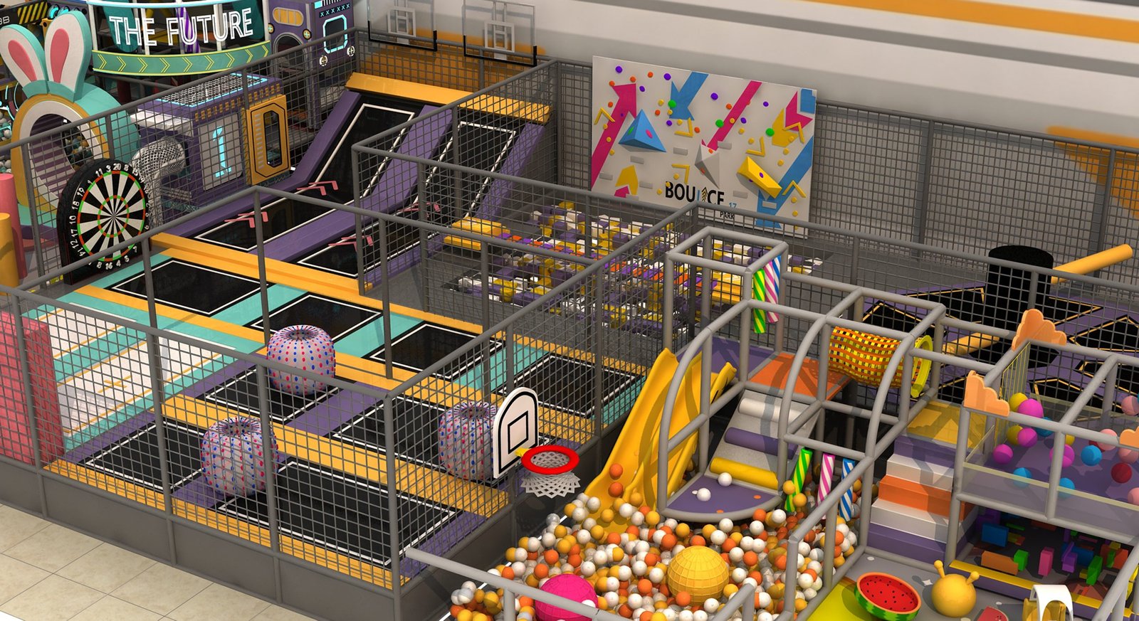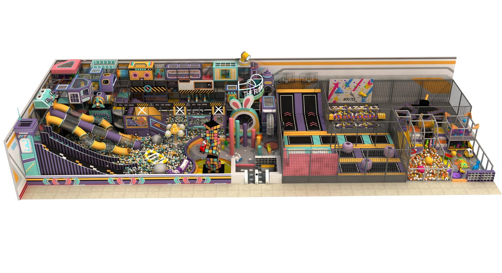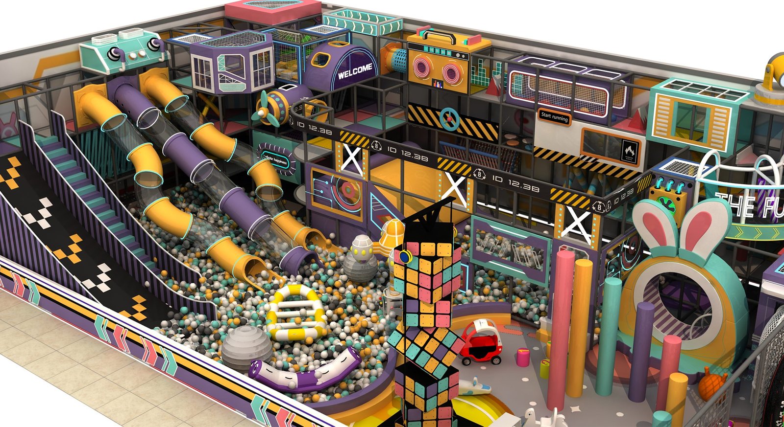 Production / Manufacturing: Components manufactured: steel frames, foam padding, slides, tunnels, and themed decorations. Quality and safety inspections conducted for the indoor playground.