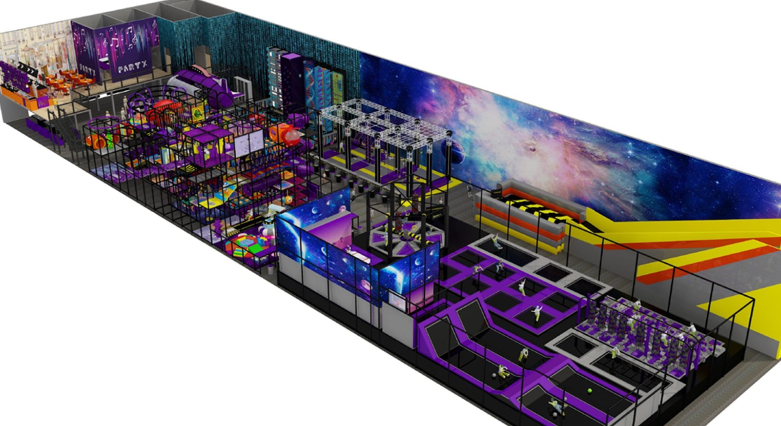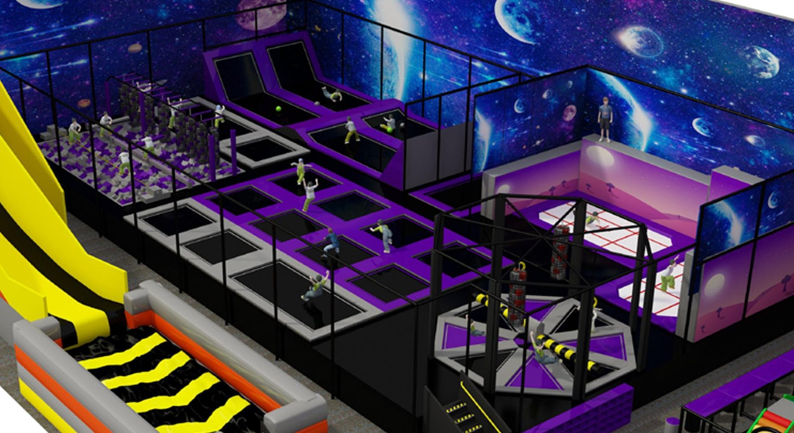 Space Maximization: Reasonable site layout and functional area division, maximizing the use of space while integrating features of children’s indoor trampoline parks and other play zones.