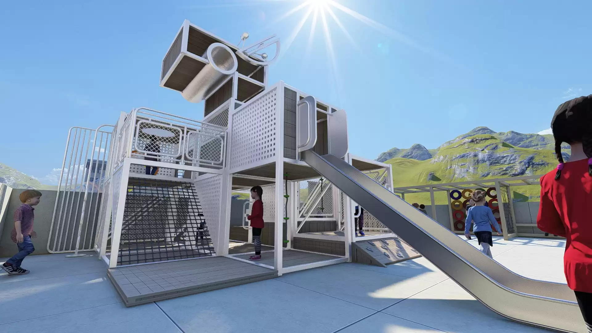 At the heart of the space is a large slide combined with a climbing net, designed to look like a spacecraft launch. The rocket-shaped platform is connected to a UFO-inspired climbing section, giving kids a playful, futuristic adventure. Below, a sandy play zone features trampolines, rocking rides, and more. The mix of soft sand terrain with sleek metallic structures above reflects the contrast between Earth’s limits and the boundlessness of space.