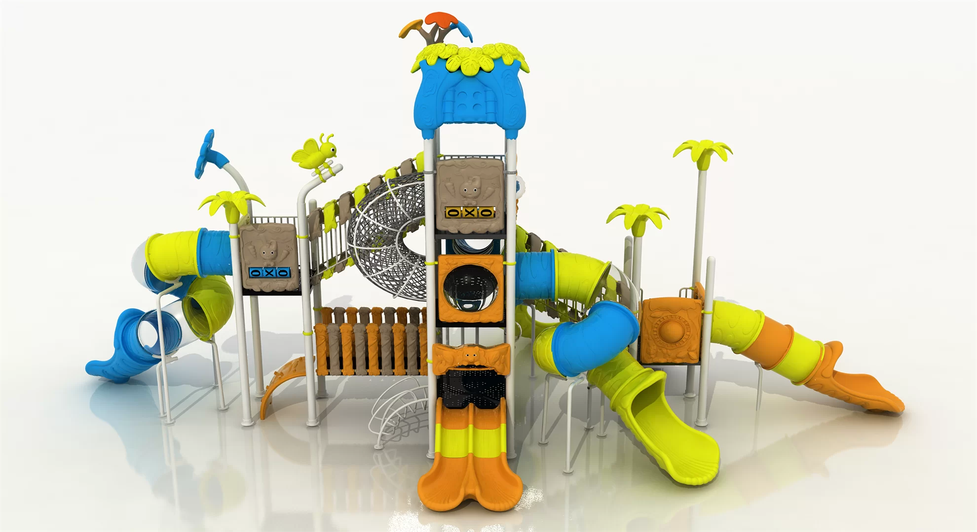 The entire design is set against the backdrop of a tropical rainforest, colorful and resembling an adventure camp, guiding children into the embrace of nature. The towering tower becomes the most eye-catching object under the clear sky, with the yellow bee logo on top symbolizing the little explorer’s connection to nature.