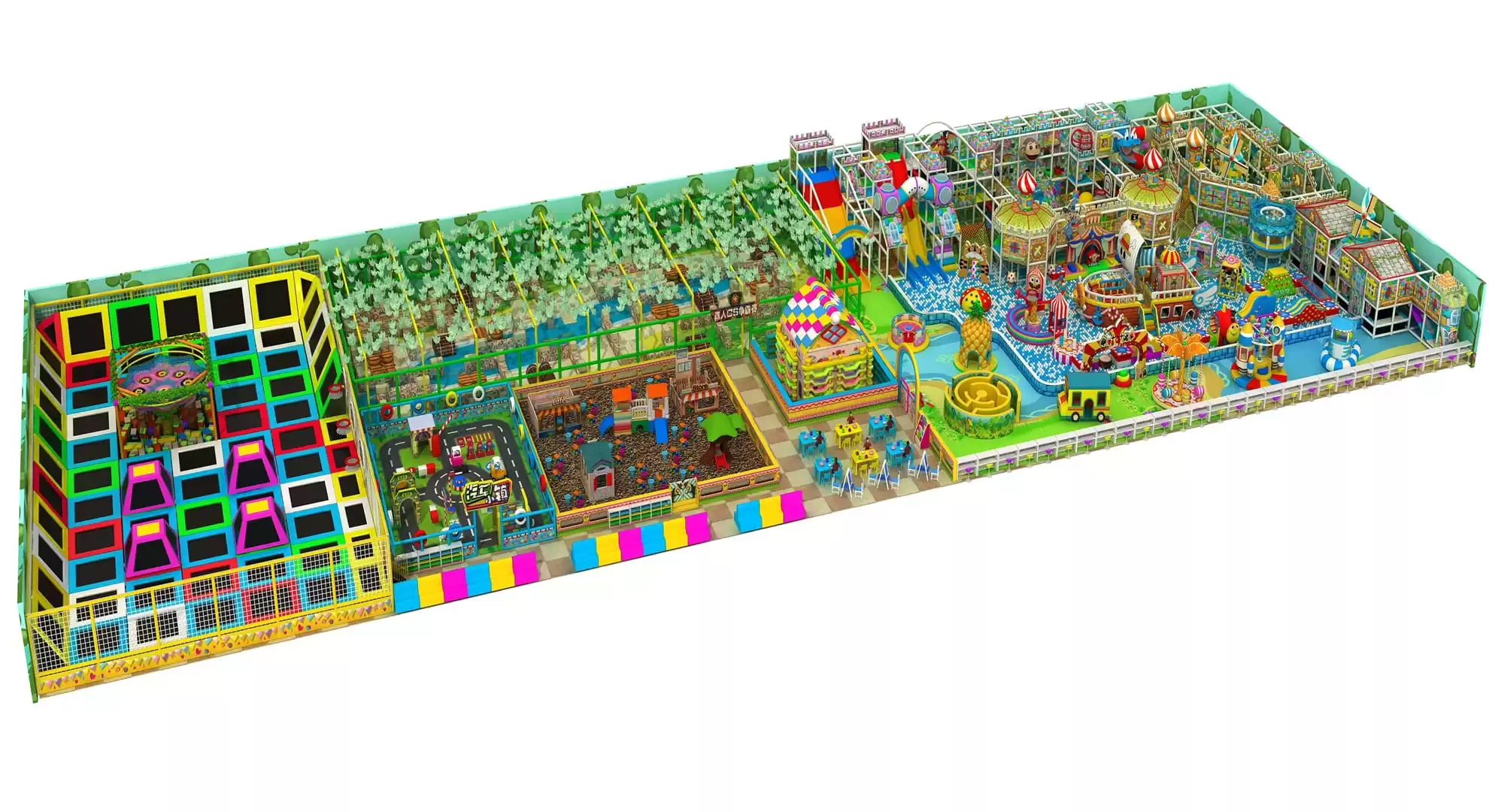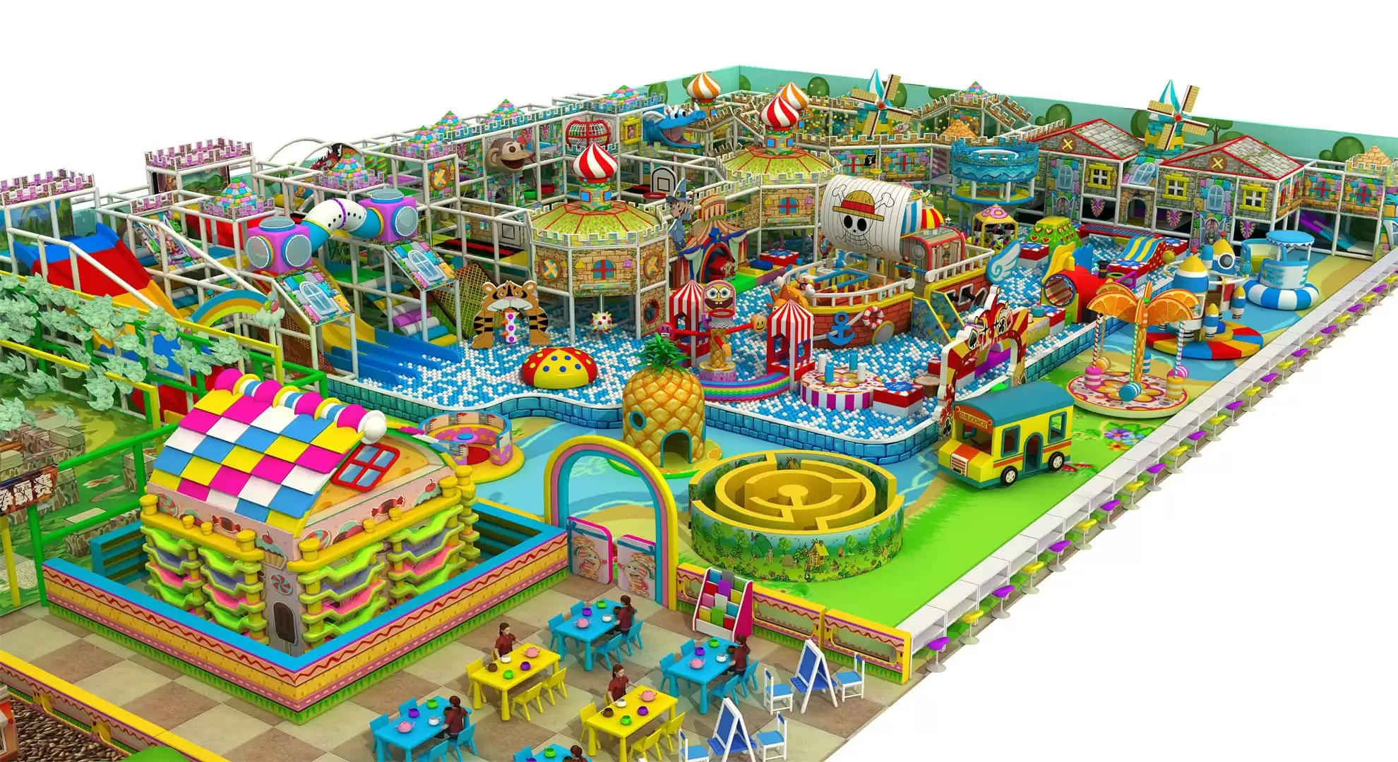 Labyrinth Zone, Candy-Themed Playland, Interactive Cooking Area, Pineapple Cottage, Slide-Connected Ball Pool, Climbing Frames, Castle Style Play Area, Pirate Ship Ball Pool, Fruit-Themed Carousel, Windmill Houses, Inflatable Fun Park, Kids’ Car Track, Live CS Arena, Trampoline Park.