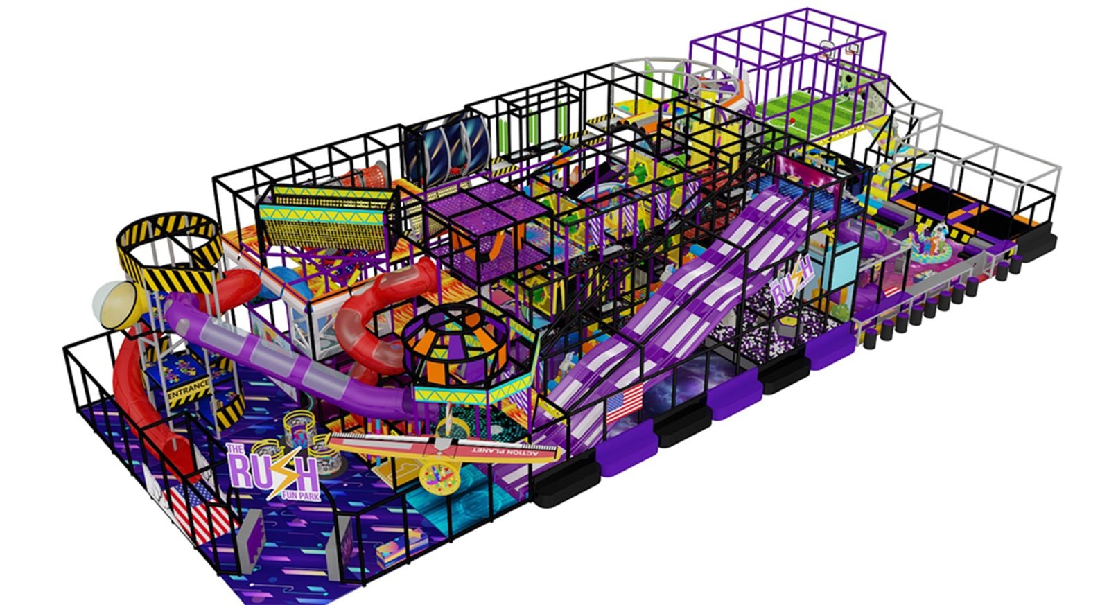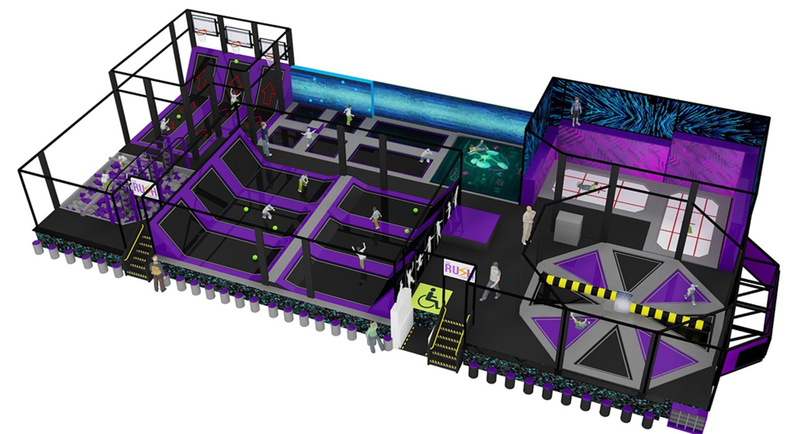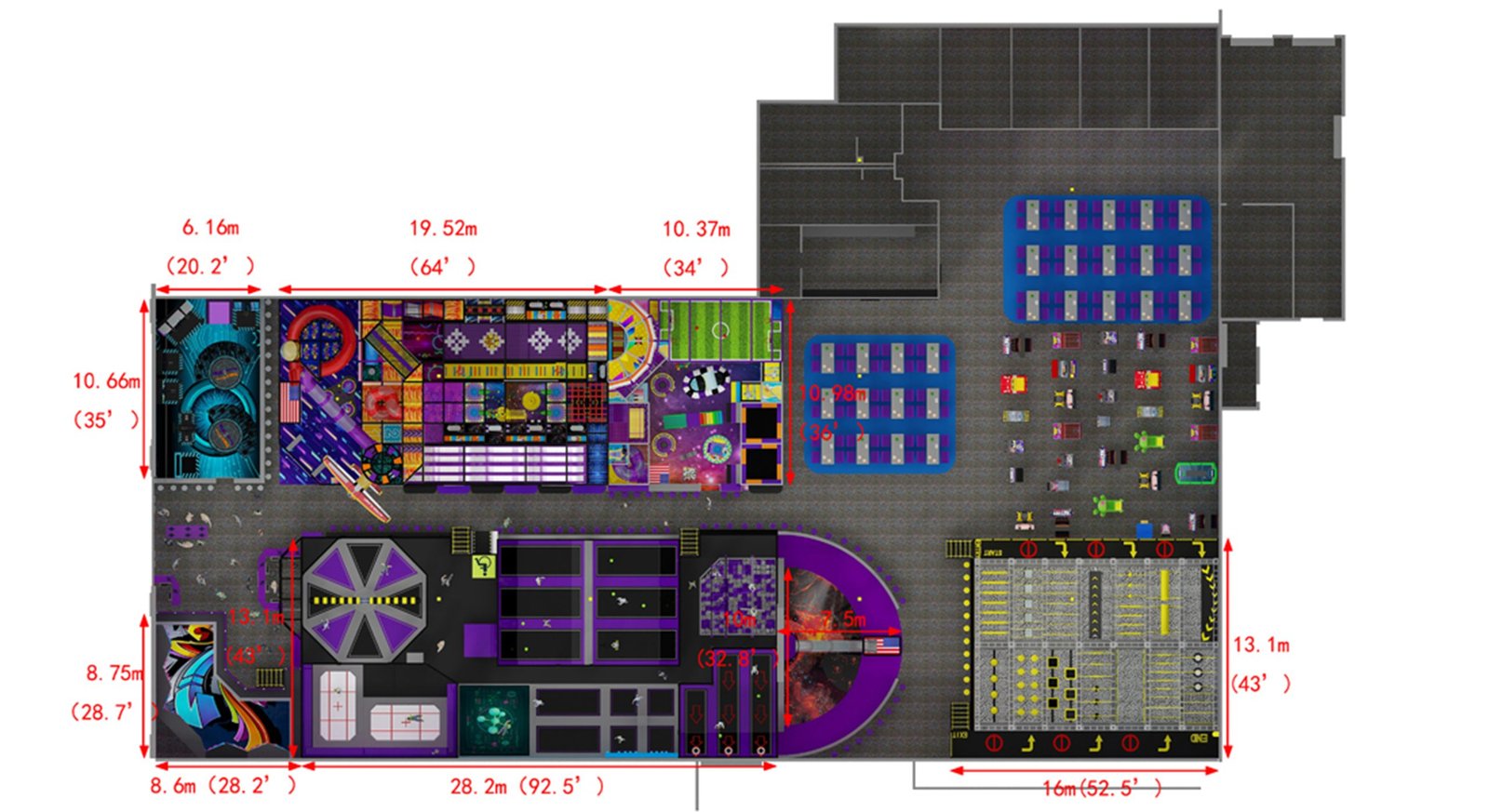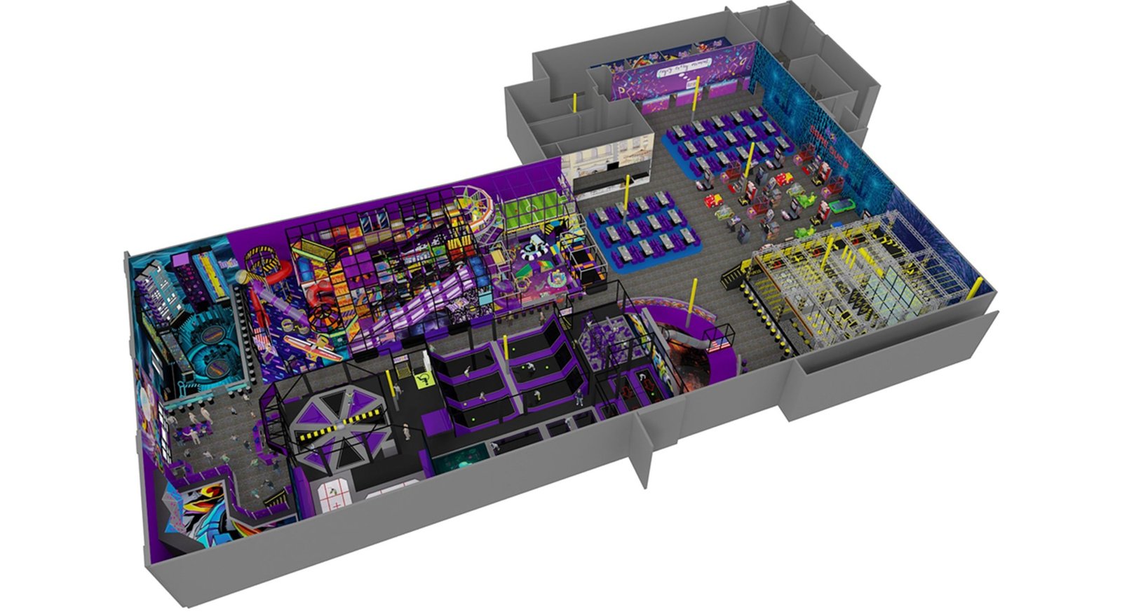 Space Maximization: Reasonable site layout and functional area division, maximizing the use of space while integrating elements of trampoline park activities and other play zones.