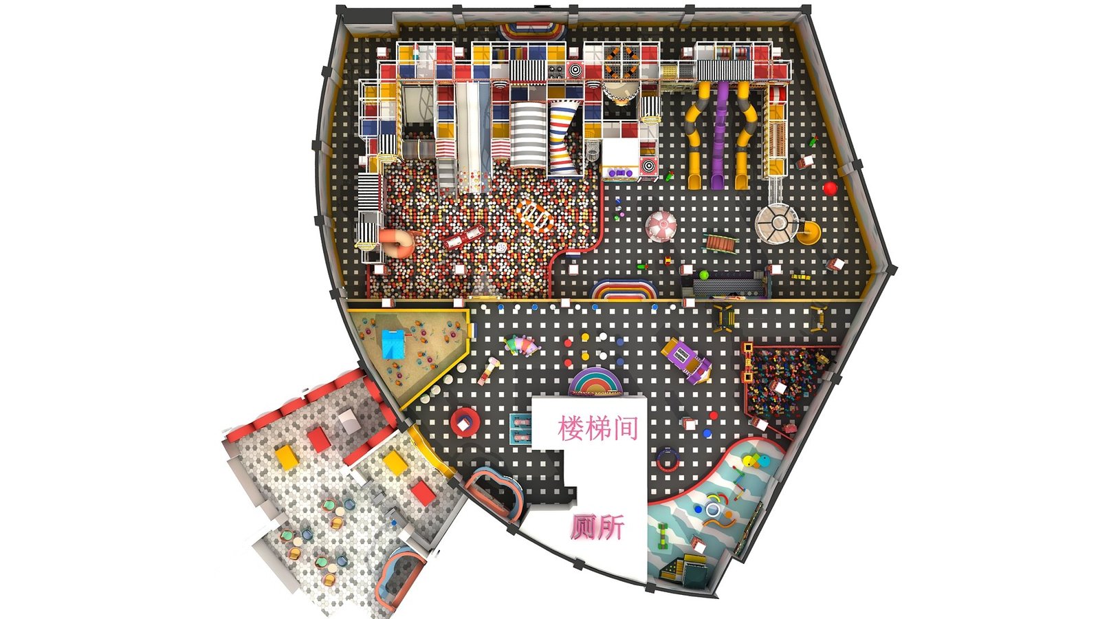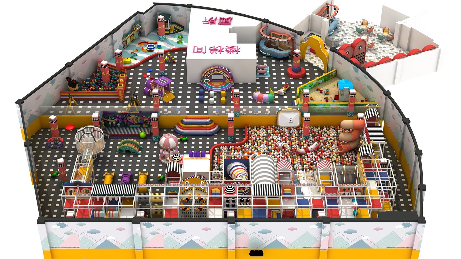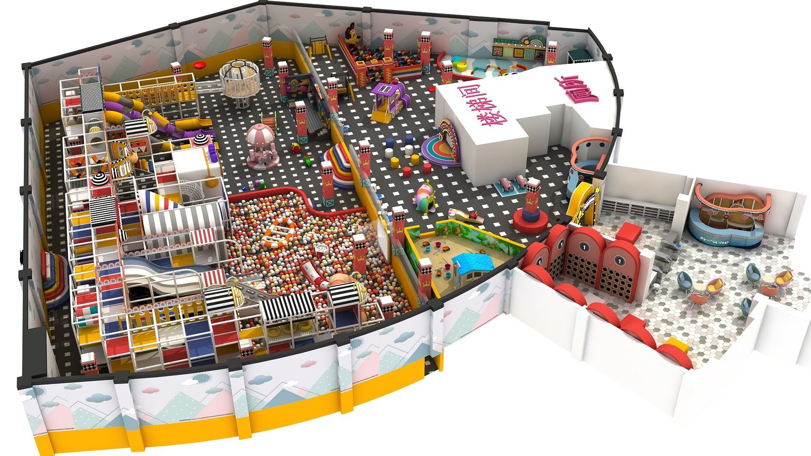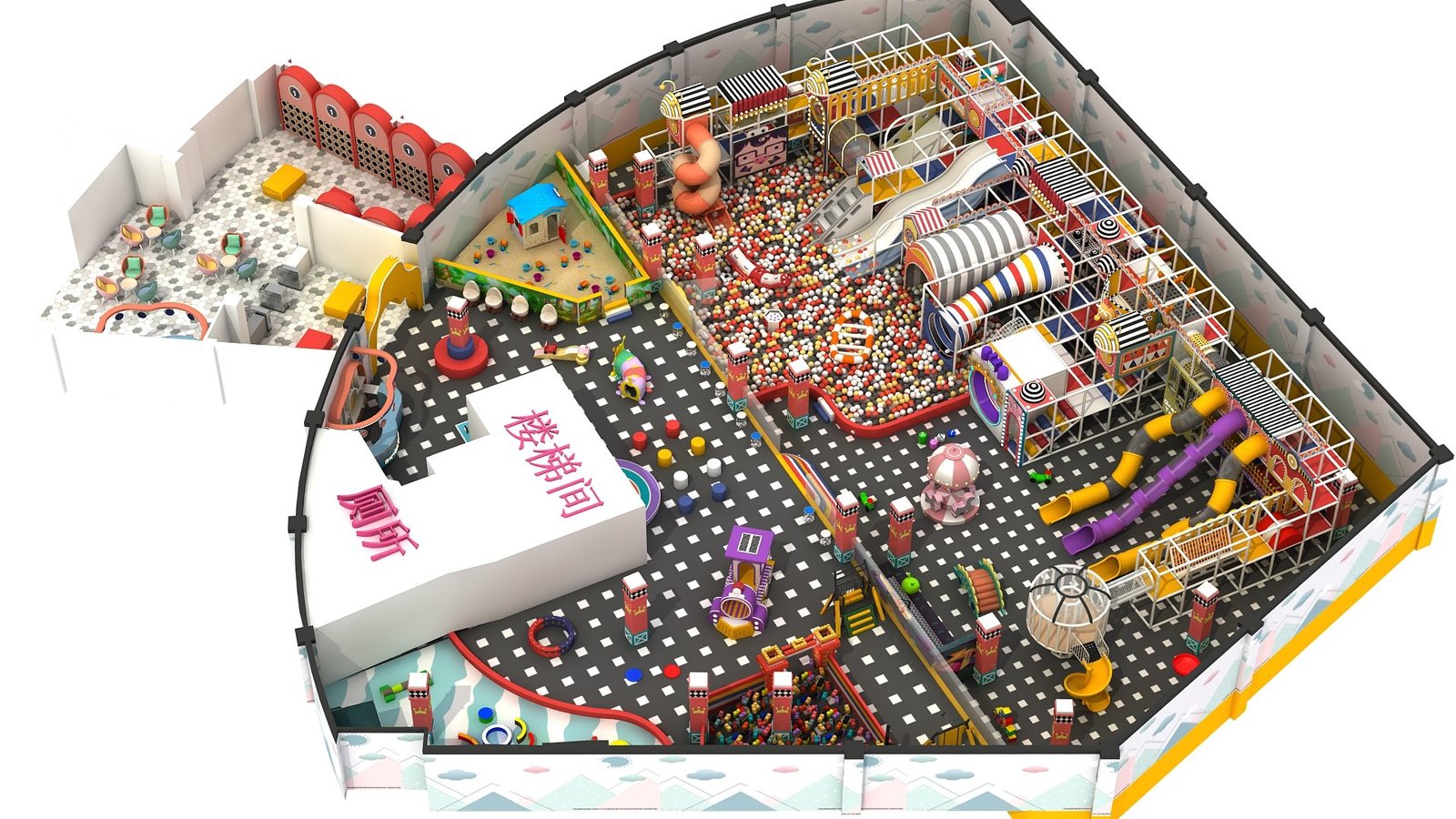 Attractions: Carousel, Expansion Tower, Sand Pit, Role Play House, Ball Pit, Craft House, Rotating Slide, Straight Slide, Climbing Ladder, Obstacle Course