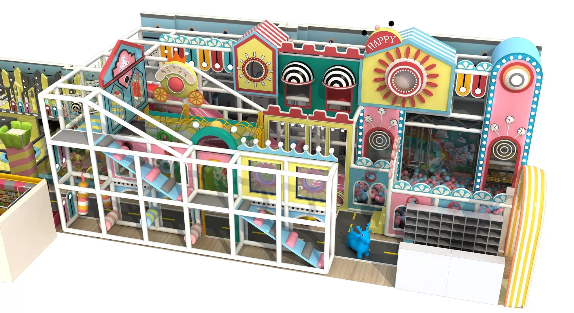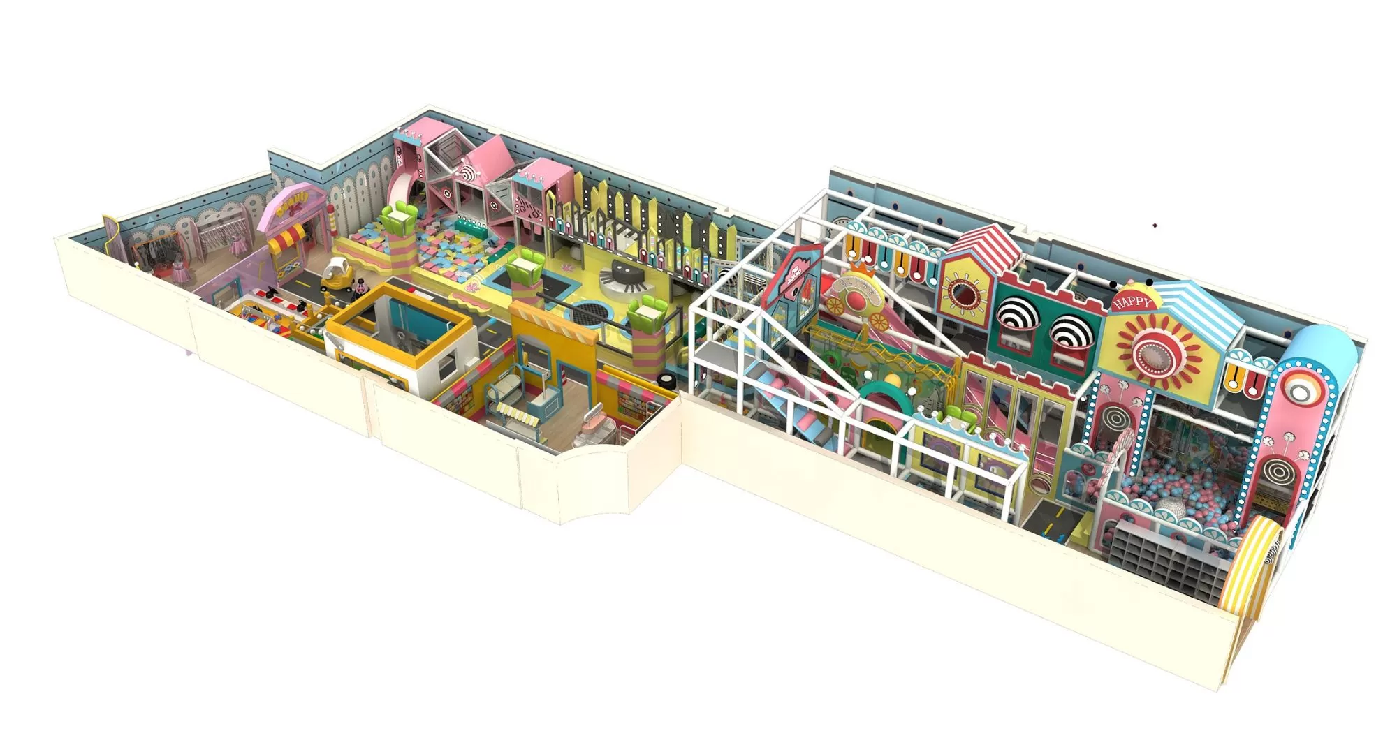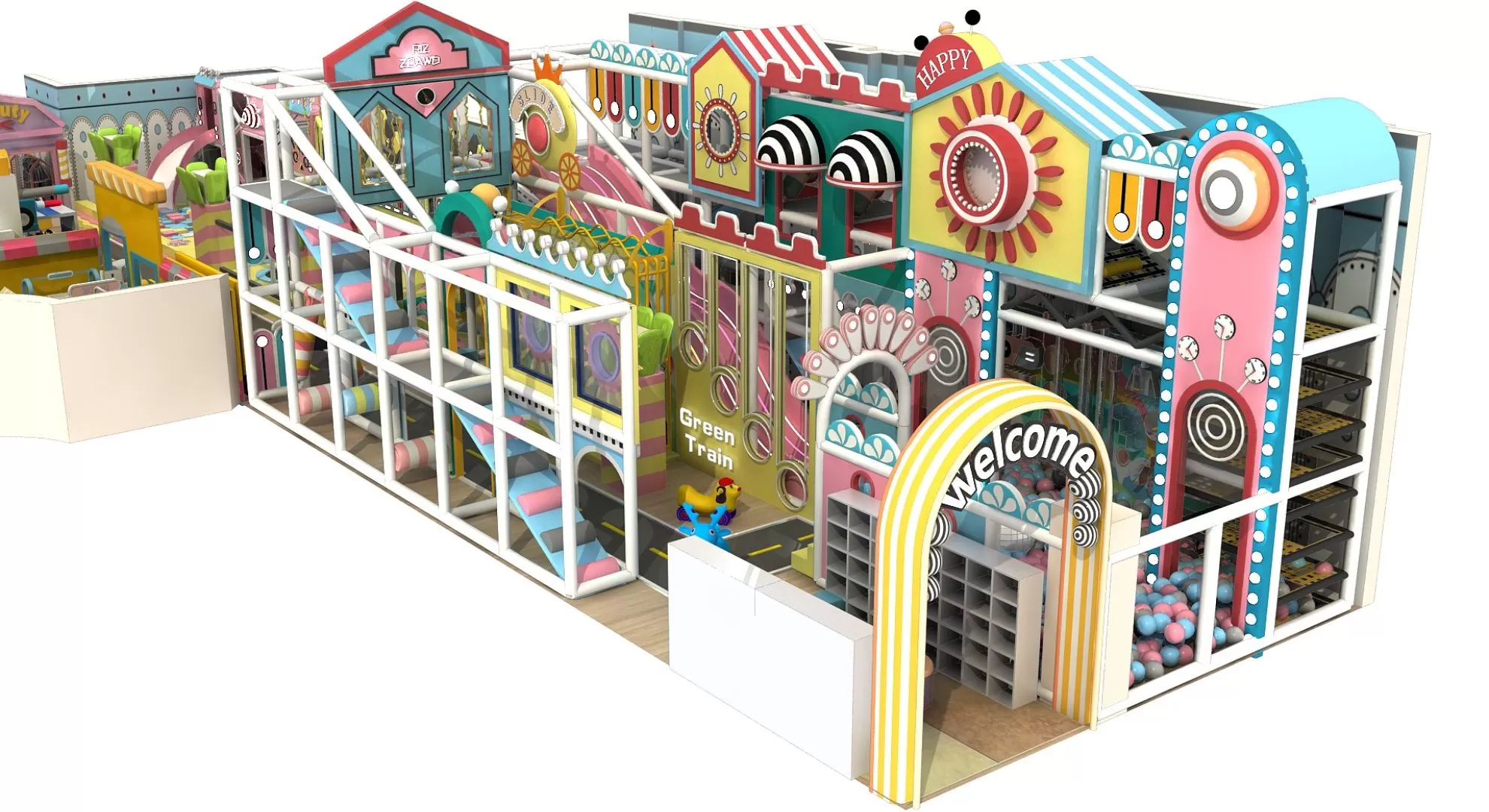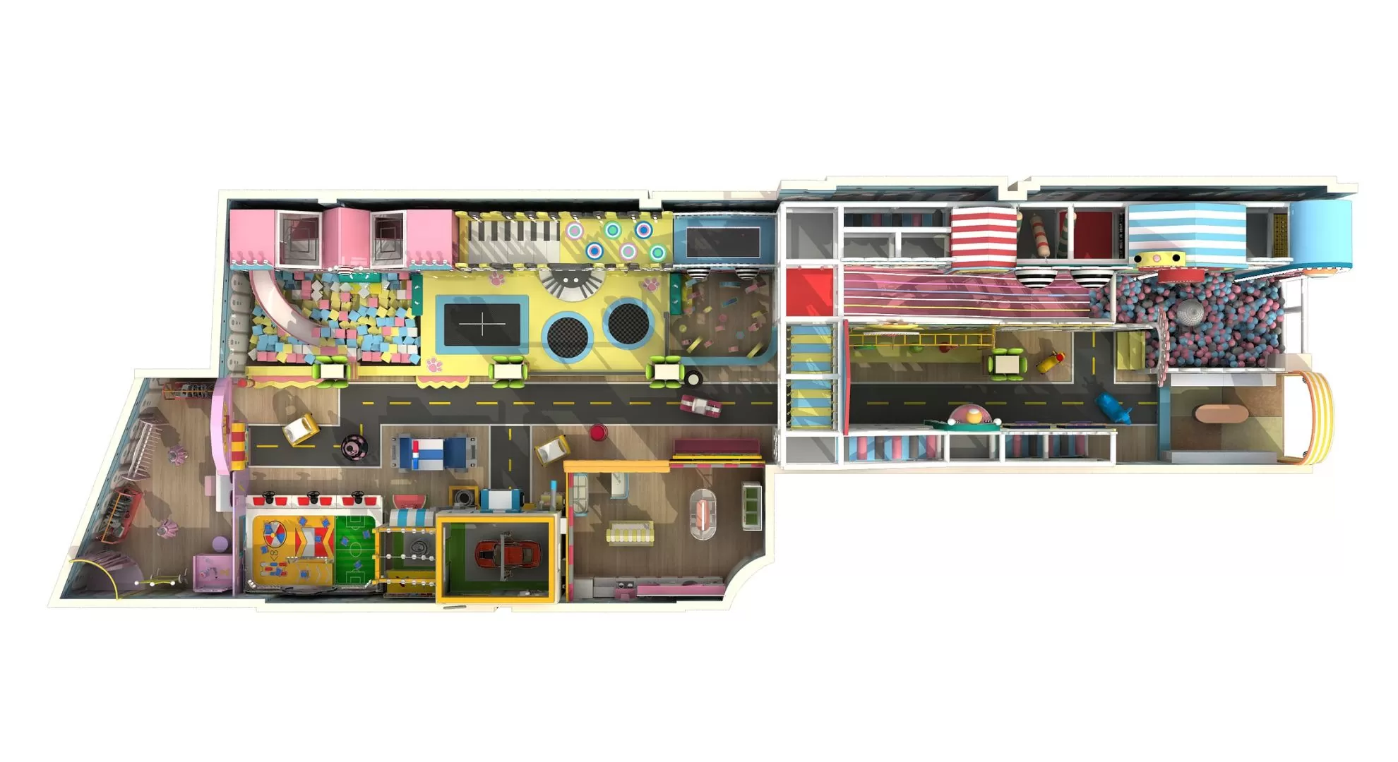 Pretend City, Ball Pit, Climbing Wall, Slides, Balance Beams, Spinning Discs, Music & Sound Panels, Building Blocks, Soft Play Structures, Trampoline, Soft Obstacle Course., etc