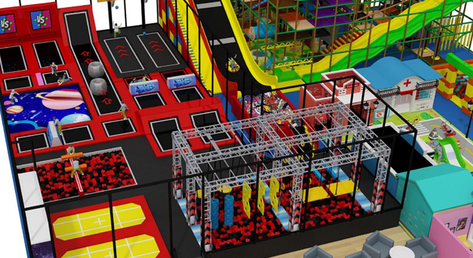 Combination Play Systems – Integrated setups combining soft play, ninja obstacles, trampolines, slides, and interactive equipment in a single, engaging environment.